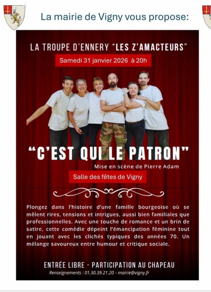 La troupe d’Ennery « Les Z’AMACTEURS » se produira à la Salle des fêtes de Vigny le 31 janvier à 20h.