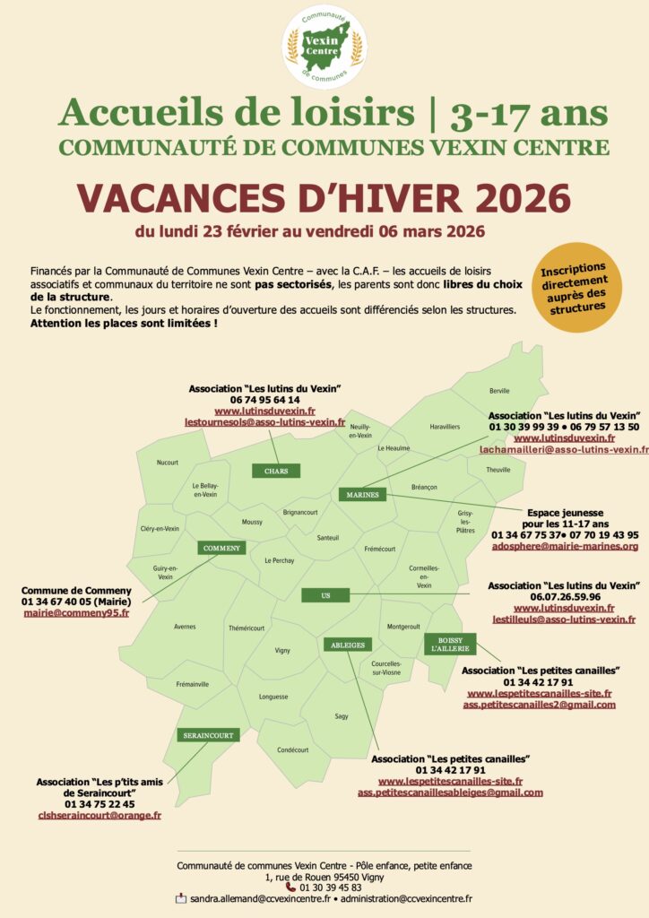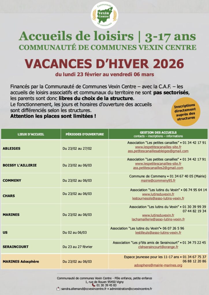 Le pôle enfance de la communauté de communes Vexin Centre vous partage le récapitulatif des dates et lieux d’ouverture des accueils de loisirs pour les vacances d’hiver 2026.